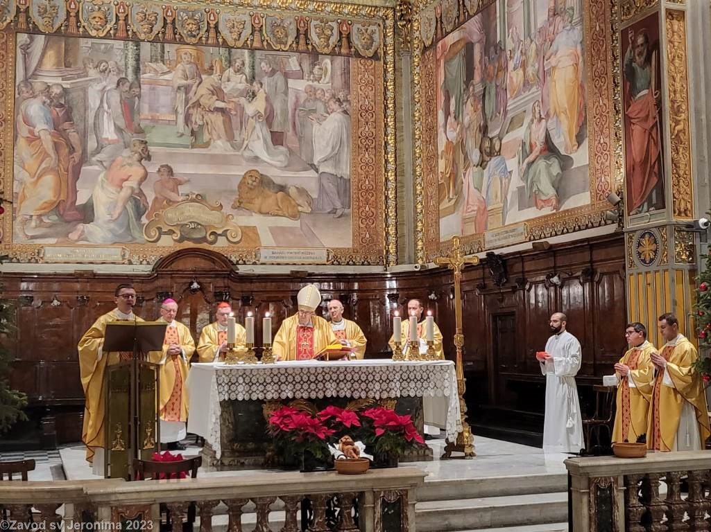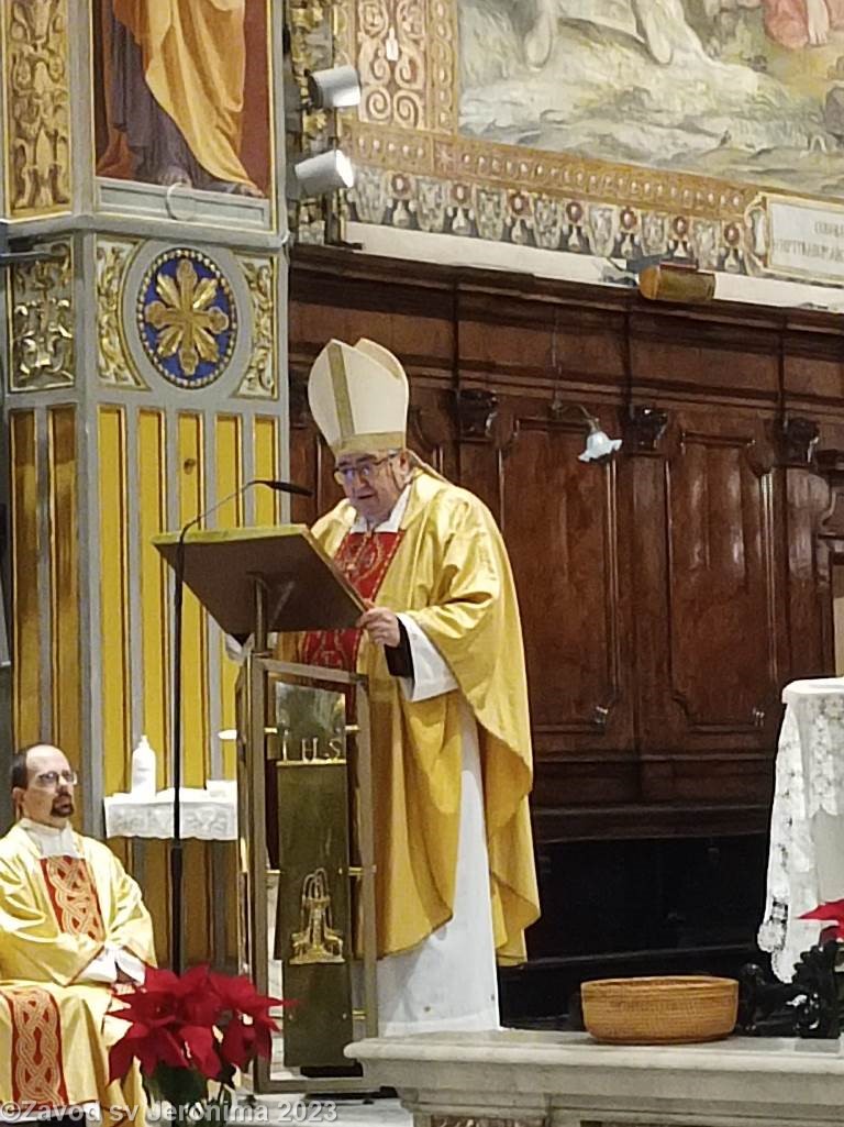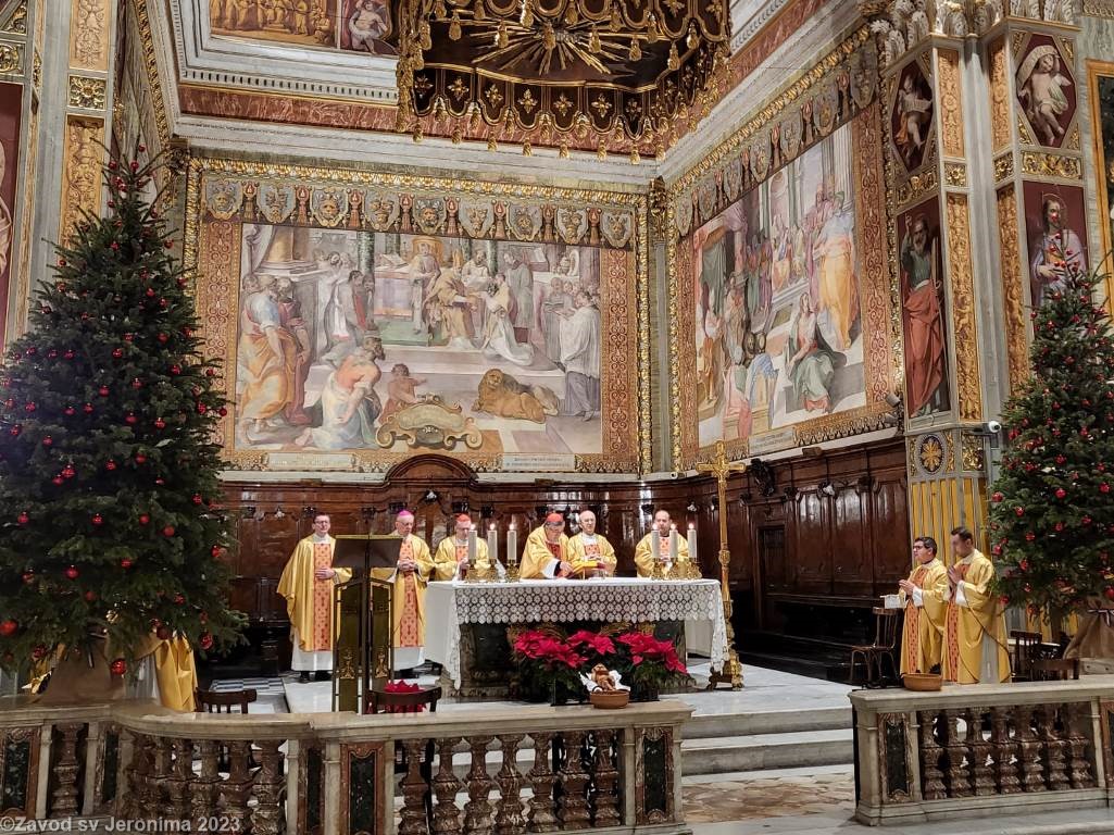 Na početku svete mise riječi pozdrava izrekao je rektor Zavoda i crkve sv. Jeronima Marko Đurin koji je ponajprije uputio čestitku predvoditelju slavlja kardinalu Puljiću budući da je upravo na Bogojavljenje 6. siječnja 1991. godine, prije 32 godine, u bazilici sv. Petra u Rimu po rukama pape sv. Ivana Pavla II. zaređen za biskupa. Rektor je srdačno pozdravio i nadbiskupa zagrebačkoga kardinala Josipa Bozanića, naslovnika Hrvatske crkve sv. Jeronima te nadbiskupa Puljića i biskupa Škvorčevića, sve druge prisutne svećenike, diplomatske djelatnike, hodočasnike iz Domovine te prisutne članove hrvatske rimske zajednice.