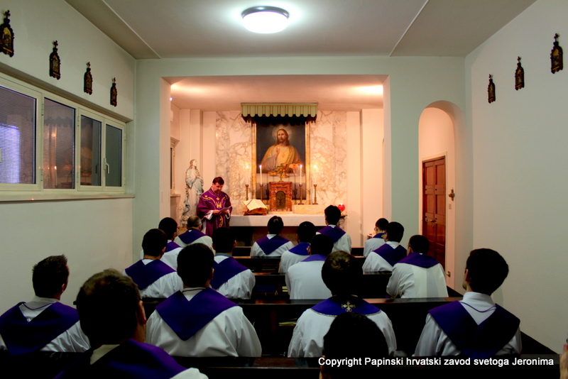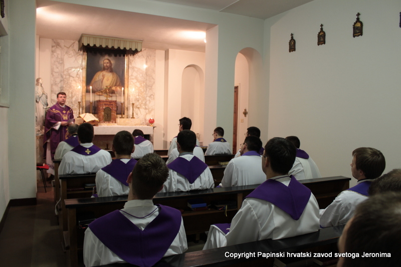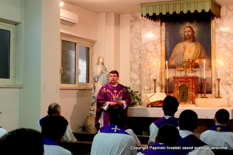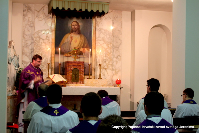 Pred završetak svoga pohoda Zavodu, msgr. Šaško predvodio je euharistijsko slavlje u zavodskoj kapelici u koncelebraciji s poglavarima i svećenicima studentima. U homiliji je potaknuo na razmatranje misnih čitanja drugoga korizmenog tjedna pod vidom nedjeljnoga evanđelja o Kristovom preobraženju. Ključne motive toga događaja, kao što su uzlazak i silazak te slava i križ, možemo prepoznati i produbiti u pojedinim evanđeljima toga tjedna, istaknuo je biskup Šaško.