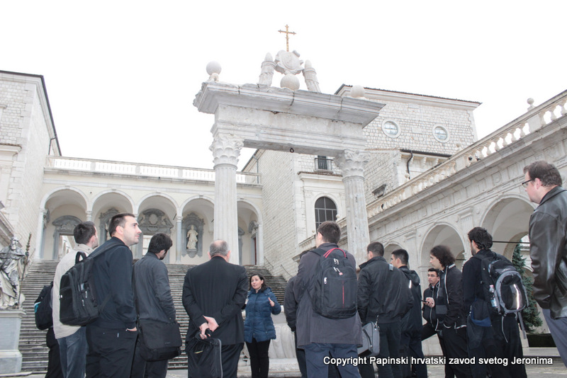 Stigavši na Montecassino, svećenici su najprije razgledali opatiju i upoznali se s njezinom iznimnom i bogatom poviješću. Ova opatija je imala ogromno evangelizacijsko i kulturno značenje za mnoge europske zemlje. Još u najranijoj hrvatskoj povijesti benediktinci iz ove opatije djelovali su u hrvatskim zemljama, na dvoru hrvatskih narodnih vladara. Nekoliko puta opatija je doživjela razaranja i pljačke ali se uvijek dizala iz pepela. Posljednji put srušena je u bombardiranju 15. veljače 1944. godine. Nakon rekonstrukcije u izvornome obliku „dove era e come era“ papa Pavao VI. posvetio je baziliku 1964. godine.