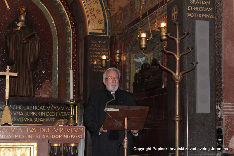 Nakon razgledavanja samostana svećenici iz Zavoda sv. Jeronima sudjelovali su u koru bazilike s monasima na latinskoj pjevanoj molitvi večernje. Potom je duhovnik o. Mihály Szentmártoni DI održao prigodno razmatranje nad grobovima sv. Benedikta i sv. Skolastike. U svome izlaganju o. Szentmártoni je usporedio benediktinsku i isusovačku duhovnost kroz tri vida: molitvu, rad i mistiku. Za benediktinca je molitva – bogoslužje. On živi u samostanu okružen prirodom, u molitvi se povlači iz užurbanosti i kaotičnosti svijeta posvećujući vrijeme Bogu. Ritam života određen je ritmom molitve. Za isusovca molitva je pak izvor snage, „trampolin s kojega skače u nove avanture“. Isusovac ne živi u samostanu, nego u rezidenciji usred grada. Njegov je ritam života određen radom koji postaje molitva. Slično je i po pitanju rada: u benediktinaca prevladava rad unutar samostana na korist samostana pokazujući da rad ima svoju unutarnju vrijednost, dok isusovac djeluje izvan zidina svoga doma želeći osvojiti ljude za Krista. Isto tako s obzirom na mistiku, može se reći sažeto da benediktinac želi Boga dati ljudima, a isusovac nastoji ljude dovesti k Bogu, istaknuo je među ostalim o. Szentmártoni. Zaključio je da dijecezanski svećenik u svome identitetu sadrži snažne elemente, kako benediktinske tako i isusovačke duhovnosti. Dijecezanski svećenik ostvaruje sklad između molitve i rada, tiho izgrađuje Božje kraljevstvo, istovremeno traži i nove putove. Pouzdaje se u svjetlo odozgor i ima hrabrosti za nove apostolske pothvate.