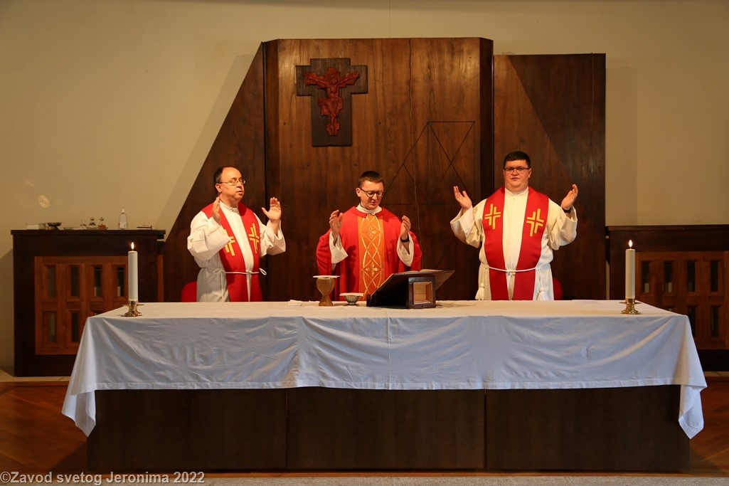 Euharistijsko slavlje predvodio je rektor Đurin, a homiliju je izgovorio p. Alan. Svoju riječ utemeljio je na Božjoj riječi koja na blagdan sv. Matije apostola iznosi činjenicu kako Gospodin svakog svojeg poslanika ne smatra slugom već ga drži svojim prijateljem. Uloga prijatelja progovarao o dostojanstvu, povjerenju, poštovanju ali i bliskosti koju Krist ima sa svojim apostolom. Homiliju je zaključio meditacijom o „Pozivu Krista Kralja“ iz Duhovnih vježbi sv. Ignacija. U njoj utemeljitelj isusovačkog reda razmišlja o časti koju ima pojedinac dok služi zemaljskom kralju upućujući potom na srž meditacije: na razmišljanje o časti koju ima svaki izbranik kojeg Krist Kralj, jedini pravi i istinski vladar, poziva da mu služi, odnosno da poput Njega položi svoj život za prijatelje.