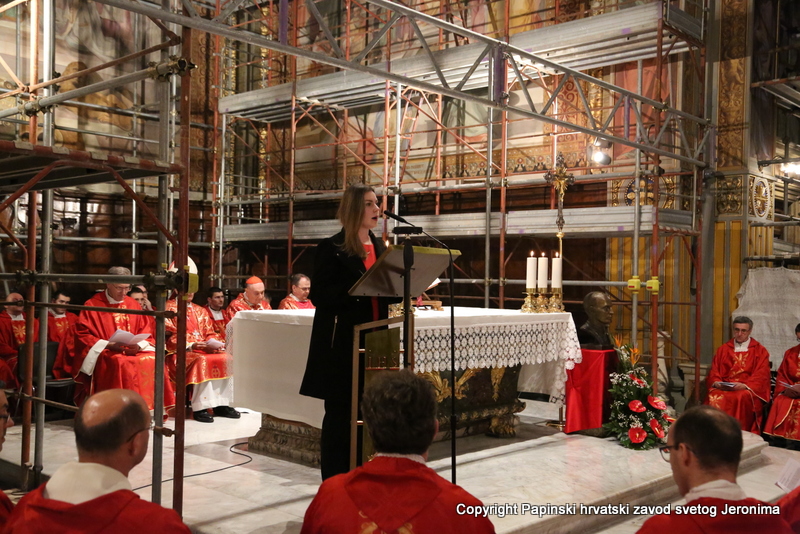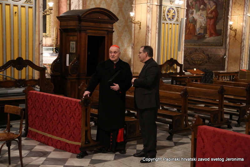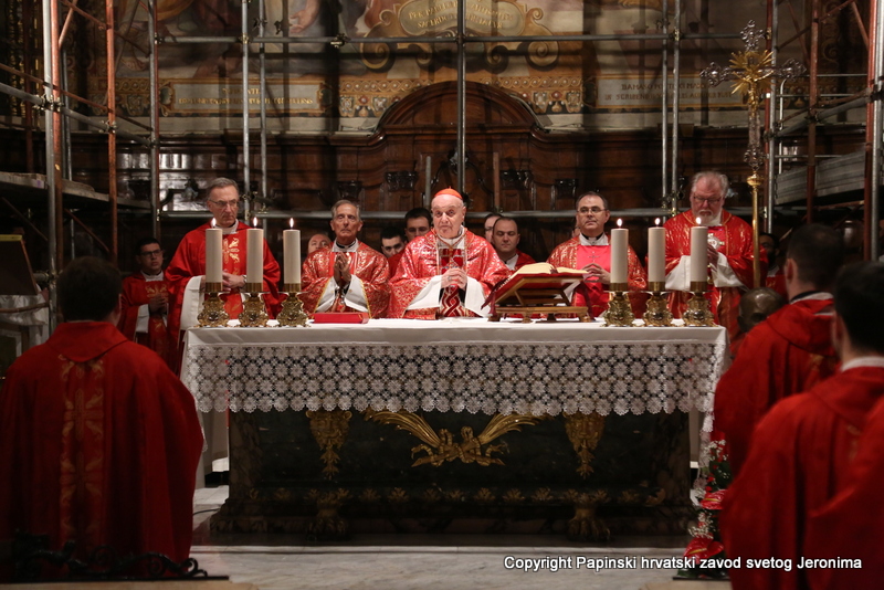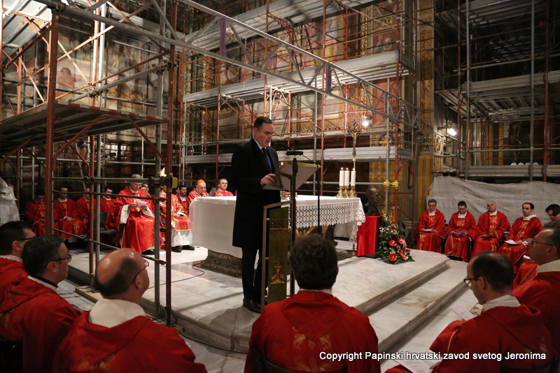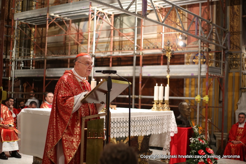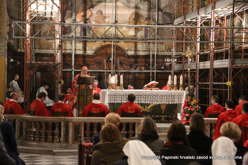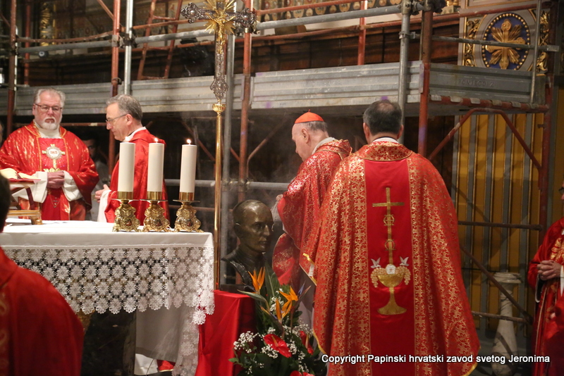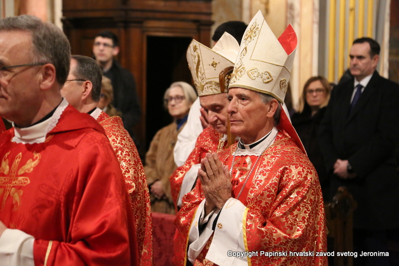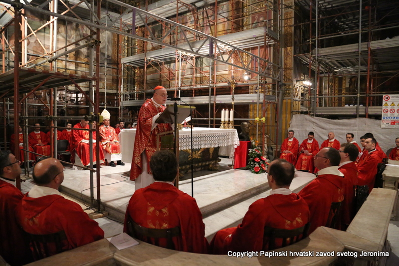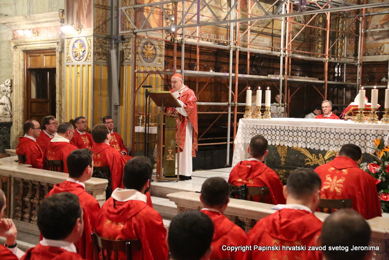 Na početku euharistijskoga slavlja rektor Zavoda sv. Jeronima preč. Bože Radoš pozdravio je kardinala Comastrija prisjetivši se nedavnoga susreta u studenome lanjske godine kada je Kardinal zajedno s hrvatskim biskupima u pohodu „ad Limina“ otkrio ploču u Bazilici sv. Petra u spomen na sva djela rimskih papa za hrvatski narod. „Ta ploča svjedoči o dugoj povezanosti hrvatskoga naroda s Petrom odnosno s Crkvom koja je sagrađena na Petru-Stijeni. Na svoj način i danas nam opet otkrivate spomen-ploču na kojoj je zapisano ime našega ljubljenog blaženika Alojzija Stepinca i koja je čvrsto ugrađena kao živ i dragocjen kamen u Crkvu – Petrovu Crkvu – duhovni Hram“, naglasio je rektor Radoš te nastavio: „Osobita nam je radost da ćete nam Vi čitati na glas s dosljedne, jasne i bistre spomen-ploče Stepinčeva života i tako nam zorno prikazati u čemu je ovaj izabranik Božji i nama danas savršen uzor.“