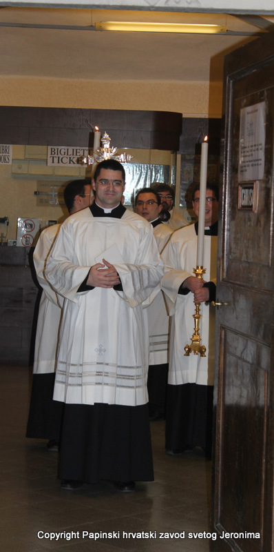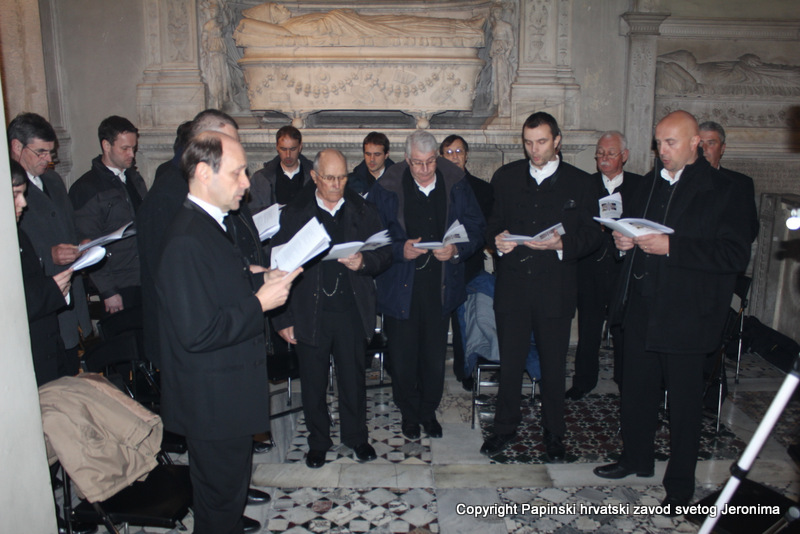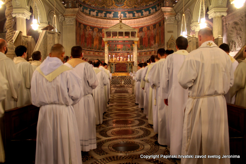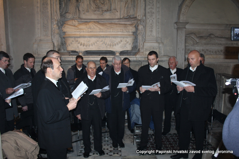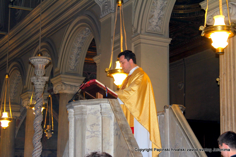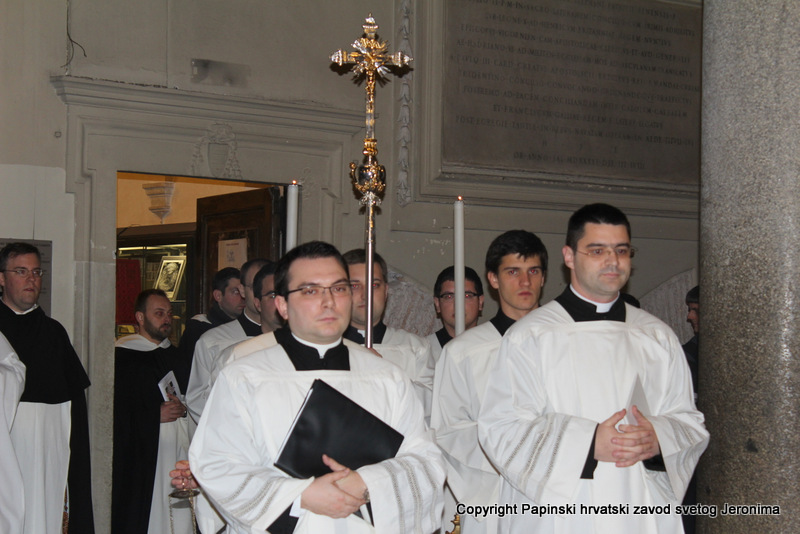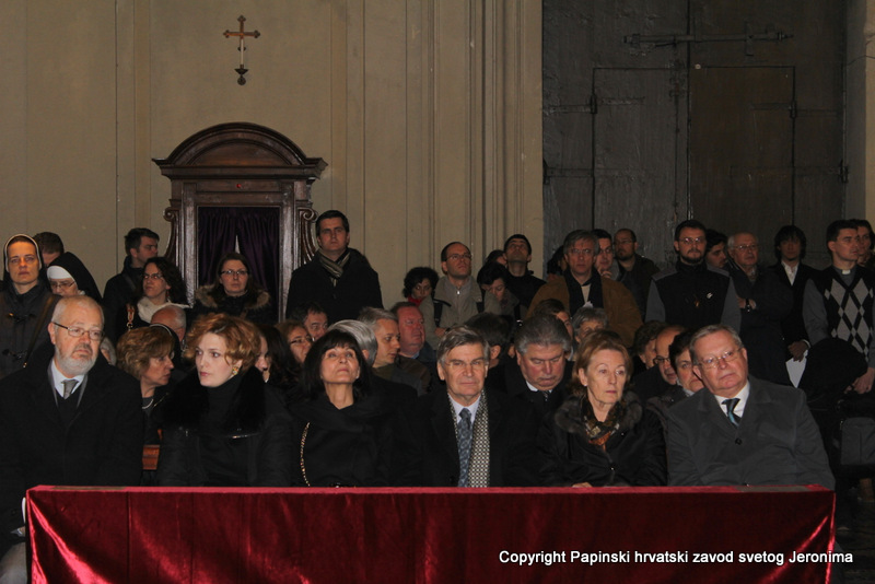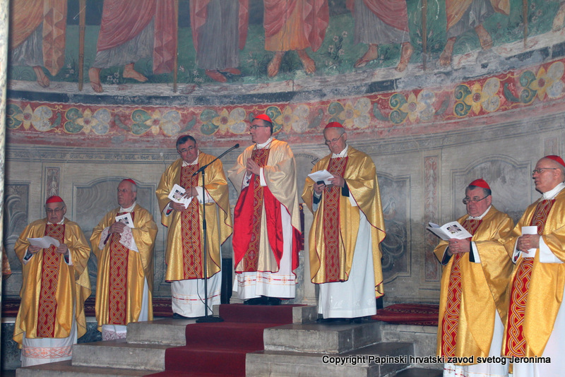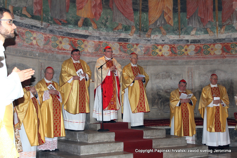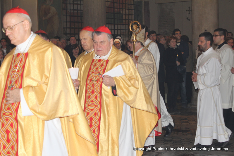000IMG_7656Zagrebački nadbiskup kardinal Josip Bozanić predvodio je i propovijedao u Rimu u subotu, 14. veljače, na proslavi blagdana sv. Ćirila i Metoda koji se prema rimskome običaju slavi na dan preminuća sv. Ćirila. Na svečanom euharistijskom slavlju u bazilici Sv. Klementa gdje je pokopan sv. Ćiril, koncelebrirali su uz kardinala Bozanića brojni kardinali i biskupi: mađarski primas kardinal Péter Erdő, nadbiskup Ostrogoma i Budimpešte i predsjednik Vijeća europskih biskupskih konferencija; kardinal Dominik Duka, praški nadbiskup i njegov prethodnik kardinal Miloslav Vlk; kardinal Vinko Puljić, vrhbosanski nadbiskup; kardinal Franc Rodé, ljubljanski nadbiskup u miru i pročelnik u miru Kongregacije za posvećeni život; kardinal Jozef Tomko, pročelnik u miru Kongregacije za evangelizaciju naroda; nadbiskup msgr. Cyril Vasil’, tajnik Kongregacije za istočne Crkve; msgr. Peter Rusnák, grkokatolički biskup Bratislave; pomoćni biskup Košica msgr. Stanislav Stolárik; msgr. Ivica Petanjak, imenovani biskup krčki; apostolski vizitator grkokatoličke Crkve u Bjelorusiji arhimandrit Sergius Gajek; te više od 100 svećenika. Među njima su bili poglavari i pitomci papinskih, slavenskih zavoda: hrvatskoga, slovačkoga, češkoga i slovenskoga, te drugi svećenici iz slavenskih naroda na službi ili studiju u Rimu, rektori rimskih zavoda, profesori papinskih sveučilišta, članovi raznih dikasterija Rimske Kurije. Svetoj su misi također nazočili brojni veleposlanici pri Svetoj Stolici i drugi diplomatski djelatnici: Filip Vučak – Republika Hrvatska, Slavica Karačić – Bosna i Hercegovina, Pavel Vošalík – Češka, Mirko V. Jelić – Srbija, te drugi diplomatski djelatnici iz Bugarske, Grčke, Hrvatske, Mađarske, Makedonije, Slovačke, Slovenije  i Crne Gore.