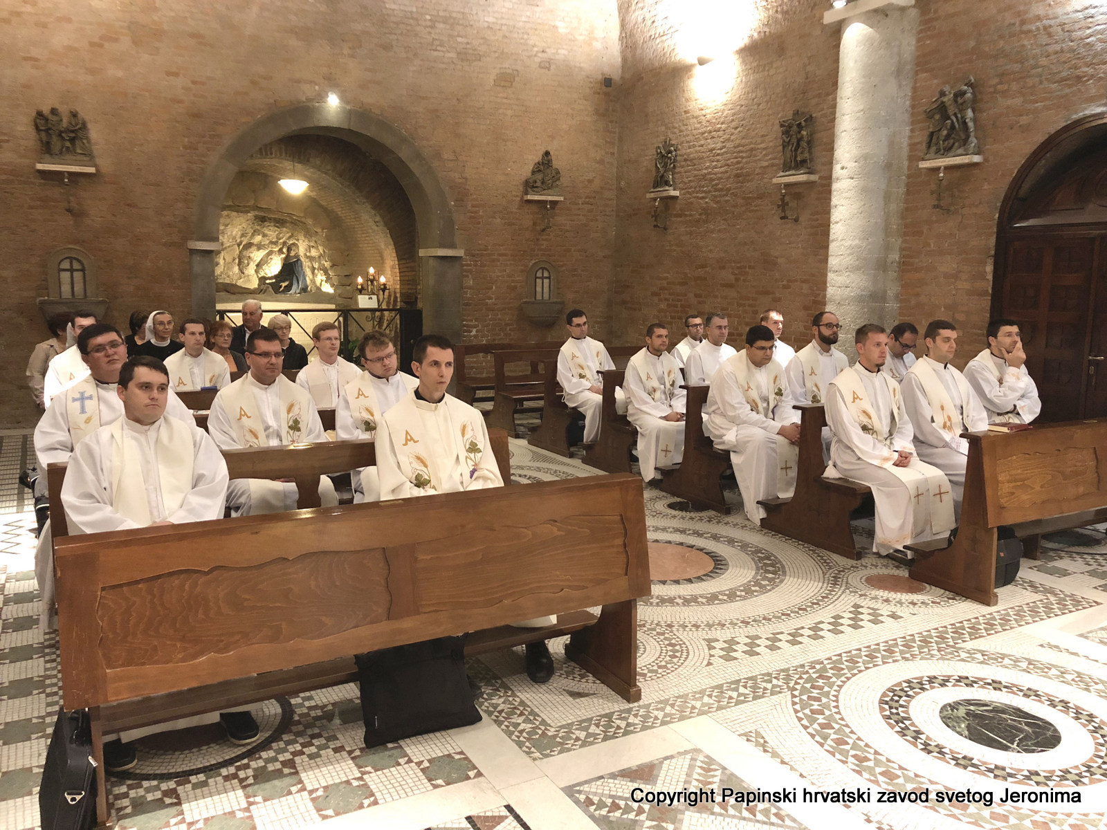 admin, 30.09.2017. Papinski hrvatski zavod i Hrvatska crkva svetoga Jeronima u Rimu proslavili su u subotu 30. rujna, svetkovinu svoga nebeskog zaštitnika. Svečano euharistijsko slavlje u crkvi sv. Jeronima predslavio je don Ivan Kovač, svećenik Mostarsko-duvanjske biskupije, službenik pri Kongregaciji za biskupe, uz koncelebraciju rektora preč. Bože Radoša, vicerektora vlč. Marka Đurina, duhovnika p. Mihálya Szentmártonija DI, nekoliko rektora drugih rimskih zavoda te četrdesetak svećenika koji su na studiju ili na službi u Rimu. Uz brojne članove hrvatske rimske zajednice – bogoslove, redovnice i studente laike – slavlju se pridružila i skupina hodočasnika iz župe sv. Mirka iz zagrebačkih Šestina, zajedno sa svojim župnikom mr.sc. Robertom Šreterom. Na misi je pjevalo Hrvatsko seljačko pjevačko društvo „Sljeme“ iz Šestina. Više/più…