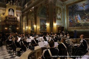 admin, 31.03.2017. Puhački orkestar Papinske žandarmerije (Banda musicale del Corpo della Gendarmeria Pontificia) pod ravnanjem mo. Stefana Iannilli-ja održao je u petak, 31. ožujka 2017. koncert u Hrvatskoj crkvi sv. Jeronima u Rimu. Izveli su desetak klasičnih i suvremenih skladbi duhovnog i svjetskog karaktera. Koncertu su nazočili brojni gosti, među njima veleposlanici pri Svetoj Stolici: Neven Pelicarić (Republika Hrvatska) i Slavica Karačić (Bosna i Hercegovina).